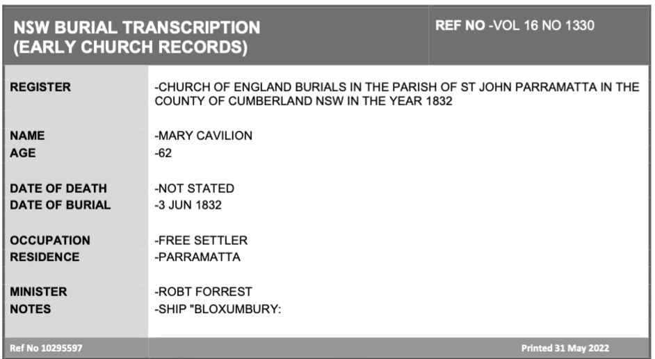 What compels us to believe that Mary was on the Broxbornebury is the name of her thirteen-year-old son, Nicholas Cavillon, listed on subsequent records. But regardless, Mary’s name is etched into the history of New South Wales as a convict, from 1814 until her death in 1832.